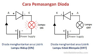 Dioda (Diode) adalah Komponen Elektronika Aktif yang terbuat dari bahan semikonduktor dan mempunyai fungsi untuk menghantarkan arus listrik ke satu arah tetapi menghambat arus listrik dari arah sebaliknya. Oleh karena itu, Dioda sering dipergunakan sebagai penyearah dalam Rangkaian Elektronika. Dioda pada umumnya mempunyai 2 Elektroda (terminal) yaitu Anoda (+) dan Katoda (-) dan memiliki prinsip kerja yang berdasarkan teknologi pertemuan p-n semikonduktor yaitu dapat mengalirkan arus dari sisi tipe-p (Anoda) menuju ke sisi tipe-n (Katoda) tetapi tidak dapat mengalirkan arus ke arah sebaliknya.